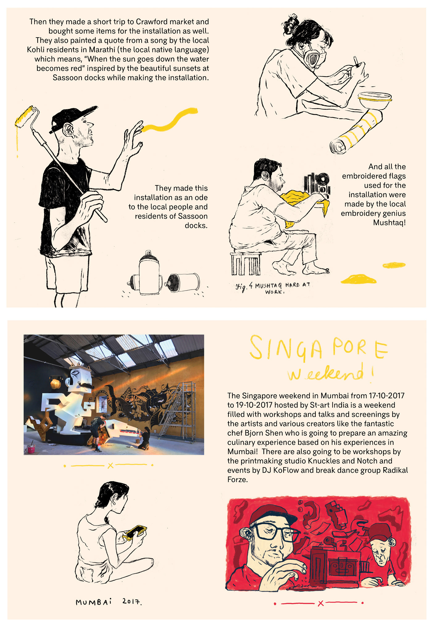 St-art India and Singapore tourism commissioned me to document and illustrate, Singaporean artists Tan Zi Xi, Yok and Sheryo's process of creating their installations at Sassoon Docks. I spent a couple of weeks making notes and live drawing them creating their installations in Mumbai.